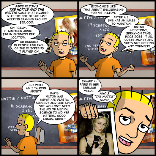 Last week when I did a comic about The Hottie and The Nottie, I spoke about not wanting to give too much attention to the film based on it’s horrid premise and the fact that Paris Hilton was its star. But when I read this article with a box office recap for the weekend, I had to gloat a little bit.