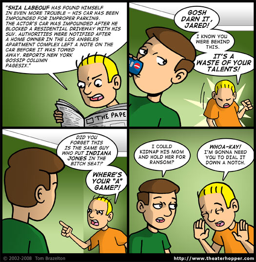 About the comic, I know that I did a Shia LaBeouf comic a couple of days ago, but the kid keeps screwing up in such unspectacular ways, he makes it too easy not to comment on it. If you click on that link and read the story about his parking mishap, be sure and check out the note someone taped to his car. Perhaps a candidate for PassiveAggressiveNotes.com?