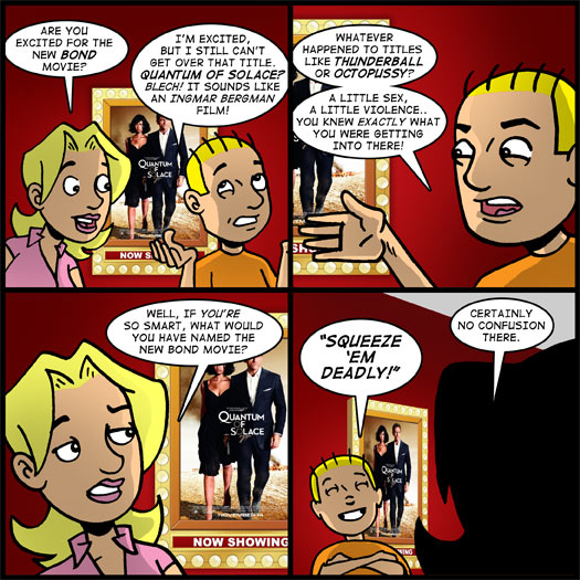 I can’t tell you how long I agonized over how to write this strip. I think I came up with 5 or 6 different treatments and felt like the “silly name” approach was the least complicated. For example, I read a review for Quantum of Solace that said it had another parkour chase sequence similar to what was in Casino Royale and I was trying to find a way to make a joke out of that. No dice.