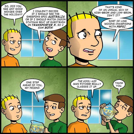 I don’t remember where the idea for mixing Pepsi with champagne came from, but I recall that it cropped up in an actual conversation between Cami and I last week. Probably before I went to see Transporter 3 on Wednesday night. That’s slummin’ it, cinematic ally speaking. Meanwhile, while we were still optimistic about Australia, it sat on the other end of the spectrum looking like a million bucks.