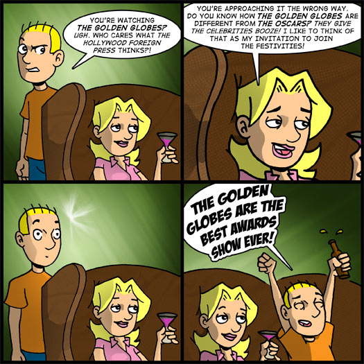 You're approaching it the wrong way. Do you know how The Golden Globes are different from The Oscars? They give the celebrities booze! I like to think of that as my invitation to join the festivities!