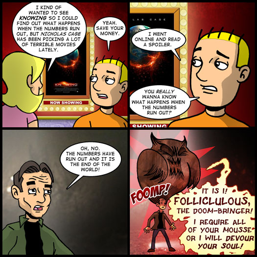 Knowing, Nicholas Cage, numbers, run out, spoiler, hair, Folliclulous, doom-bringer, mousse, devour your soul