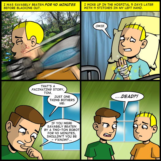 To me this comic is funny not because Jared doubts Tom’s story about being assaulted by an anthropomorphic piece of audio/visual equipment. Instead he finds the story questionable because Tom’s injuries are not consistent with the length of his beating.
