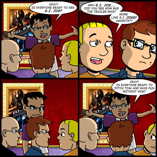 G.I. Joe: The Rise of Cobra comes out today and it is very likely that I will be seeing the movie with my friends Gordon McAlipin from Multiplex, Zach Miller from Joe and Monkey and Joe Dunn from Joe Loves Crappy Movies as I have depicted here. At least, I hope that’s what happens. We have a nice little tradition of seeing movies together when we’re in town for the convention and I hope everyone can make it.
