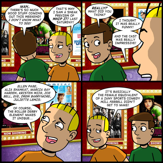 On Monday I talked a little bit about seeing a sneak preview of Whip It! last Saturday. I promised a review at some point. A review the never came. So, instead, you get this comic and I’ll kind of splice in portions of the review I was going to write here in the blog post.