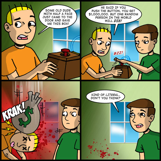 Eh, now that I think about it, if I was confronted with the scenario, I could make as much money not pushing the button than pushing the button. I’d just go to the media and then the authorities in that order. I mean, the public would definitely get a kick out of the story and I could probably milk a few interviews, and a book deal out of it. Bam, instant money and no one dead.