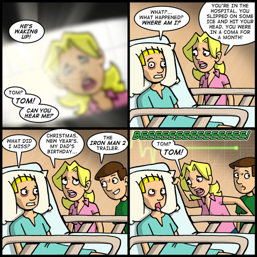I thought it would be kind of fun to address my hiatus in the comic with a short story arc. And, as in most soap operas, a coma was an easy out.