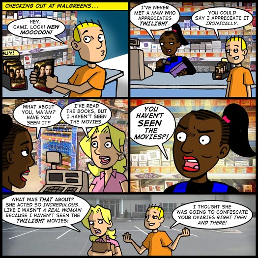 Today’s comic is an almost word-for-word exchange we had with a cashier when we were checking out at Walgreen’s last Saturday. They had a bunch of New Moon DVDs sitting out on the counter to tempt you with a last minute purchase. For reasons I can’t explain, I grabbed one and decided to taunt Cami with it. The cashier mistook my playfulness for genuine interest in the franchise and what followed was a weird, slightly sexist one act play.
