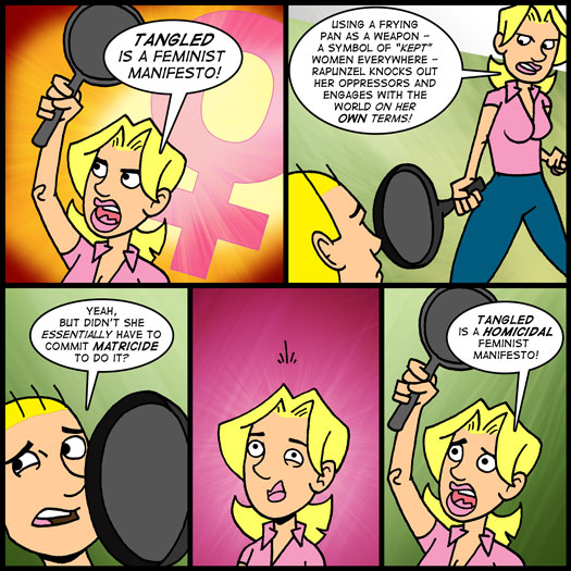With criticisms of Disney’s history in mind, the fact that Rapunzel uses a frying pan as a weapon in the movie felt somewhat deliberate to me – especially when coupled with the “kept” woman metaphor and being locked away from society. Think about controlling husbands – the “go make me a sammich” neanderthals who dictate their wife’s social life, the friends she can see and who she’s allowed to talk to.