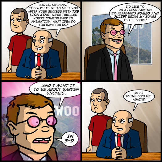 I have a friend who worked for Disney Animation during several years of Gnomeo’s production, and from what he told me, you’re bang on. The movie only exists as a vanity project for Elton John, and it was terrible from day one.