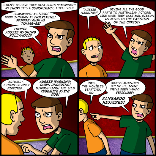 As an Aussie, while I think the various Ozphobic terminology was genius, I have to say a few Aussies taking hero roles is hardly an invasion. Besides, if the Americans couldn’t find someone suitably man-tastic for the role of Thor, that’s really more a reflection on the diminishment of the Amercan physique. š