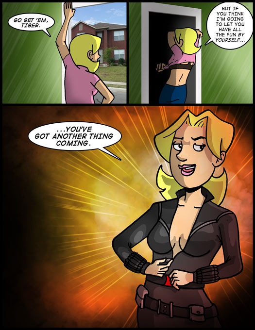 Anyway, let’s talk about the comic! Sexy, no? The first time Cami appeared as the Black Widow in this comic from 2010, I proved very popular. So, like the hustler I am, I decided to up the ante a little bit. Yeah, maybe it’s a little salacious. But I’m putting a ribbon on this in August. What do I care, right?