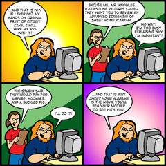 I think the Aint It Cool News phenomenon really reached its apex around the time Knowles start portraying himself as some kind of internet success story and the parlayed that into some kind of faux-celebrity. I remember him guesting with Roget Ebert in the interm after Gene Siskel had died and before he had been replaced with that dolt Richard Ropert.Watching him butt heads with Ebert in some act of cool defiance, I thought to myself, “This is it. I’m watching the end of irony.”