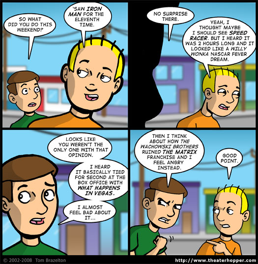 I wasn’t able to make it to Speed Racer this weekend. Instead I saw Iron Man for the second time with a friend I hadn’t seen for a while. By the time I was weighing my options and considered going on Sunday night, box office reports were in and things looked dire.