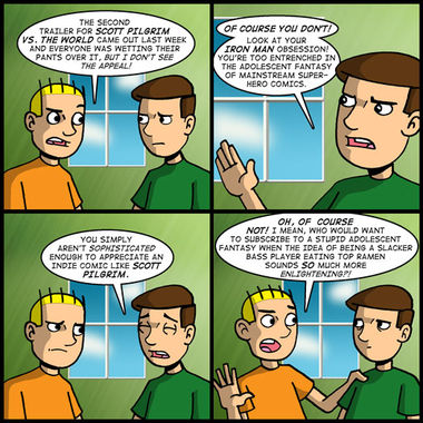 I realize this comic might get me in a little bit of trouble with the pants-wetting crowd excited for Scott Pilgrim Vs. The World. Don’t get me wrong. I’m excited to see it, too. But after watching the effusive praise pour in across Twitter last week when the second trailer was announced, I was left wondering what all the fuss is about.