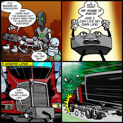 There’s usually not a lot of argument as to the question of mortality when one is struck broadside by an eighteen-wheeler. But if you need further evidence of David’s untimely demise, vote for Theater Hopper at Web Comics List for the proof.