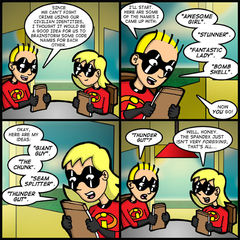 └ Tags: Awesome Girl, Bombshell, civilian identities, code names, Fantastic Lady, fighting crime, Giant Guy, Seam Splitter, spandex, Stunner, The Chunk, The Incredibles, Thunder Gut