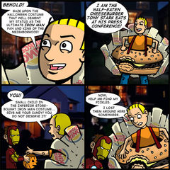 I think if I made one mistake with this story arc, it’s that I didn’t push the idea that Tom wanted to defy expectations of him running around in an Iron Man costume far enough. The idea was really in response to my own catch-22 with my relationship to the movie and the character. On the one hand, I love talking about it. On the other hand, I know some of you are sick of Iron Man comics. Believe me, I understand. But in the meantime, many of you are very supportive of my love for the character. So what do you do when Halloween rolls around you need to put your character in some kind of costume? Bottom line, it would just look weird to suddenly have Tom running around as The Joker when he’s spent all year talking about Tony Stark. I thought the cheeseburger idea was kind of a happy compromise. A way to talk about Iron Man without putting Tom in the Iron Man costume. I think, for the most part, it was effective. It was a fun little guessing game for the week to see what Tom was finally going to emerge as.
