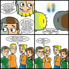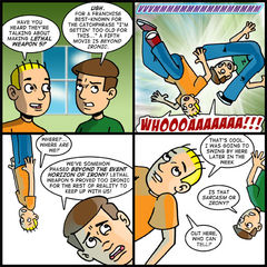 This isn’t the first time I’ve used to comic to explored the metaphysical. I never really understand my own motivations with these strips or what I hope to accomplish. But it’s a cartoon, y’know? It’s fun to play around in the sandbox sometimes. Frankly, I could see myself doing another strip set beyond the event horizon of irony – if for no other reason than to have an opportunity to use that phrase again.