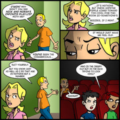 Cami was legitimately against seeing Nick and Norah’s Infinitie Playlist (and yes I realize I left the “H” out of “Norah” in the comic – typo) because she thought it skewed outside of our demographic. She’s not exactly wrong. It’s pretty much for the Hollister and hoodie set, but I don’t care. I gotsta have me my Michael Cera and Kat Dennings. These two should be in movies together for the next 10 years.