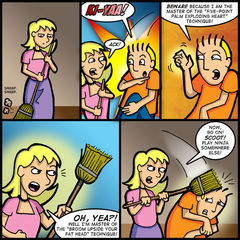 I have no idea where today’s comic comes from. Probably from the fact that Cami and I did – in fact – see Kill Bill Vol. 2 on Saturday night and then spent most of Sunday afternoon cleaning up the house. I guess I thought it would be funny if Cami was treating me like a 5 year old “playing ninja” by shooing me out of the house with a broom. I dunno!