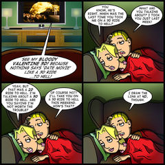 Today’s comic is based on a stray thought that I expressed in Wednesday’s blog. Basically, I wanted to make a comic about it because no one has seemed to clamp down on the ridiculousness of the tagline in My Bloody Valentine 3D’s trailer. Read it again with me.