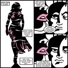 I hate to explain the joke, but the idea is to blend the gritty noir of Miller’s work with the sublime mundane aspects of suburban couple hood. Not a lot of panels to do that with, so I hope you get the gist of it.