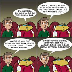 What I really like about this strip is how true to life it is. I could finish a full lunch – a giant hamburger cooked medium well, juices running down my chin, a side order of fries, a tall soda… and if I take one step into a movie theater not 10 minutes later, I’ll be like “Ooo! Kettle Corn! Gotta get a bag of that!”