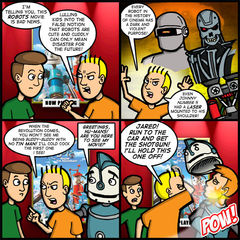 I wanted to show a lot more robot carnage in today’s comic, but there just wasn’t enough room to show Jared dismantaling all of these dopplegangers in a tiny self-storage unit. I decided one powerful image would have to do the trick.