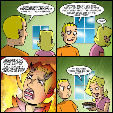 I was sitting around last night thinking about the juxtaposition between Clint Eastwood’s fuzzy, feel-good, “Hey, you’re gonna die, but it’s okay” Hereafter and the money-grubbing “INVISIBLE DEMONS ARE EATING YOUR BABY” Paranormal Activity 2 and felt that it was a potential comedic goldmine.