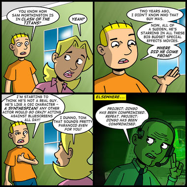 Does anyone remember the movie S1m0ne referenced in the title of today’s strip? It was a movie starring Al Pacino from 2002 where a movie producer digitally creates a synthespian – an actress that becomes an international celebrity. It’s a terrible movie, but an interesting idea.