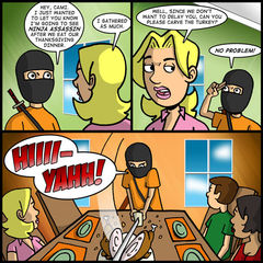 At any rate, when I do a Thanksgiving strip, it’s my goal to reach a few steps beyond the whole "families are crazy!" cliche. But then again, if Tom stomping around in a Leatherface costume isn’t crazy, I don’t know what is!