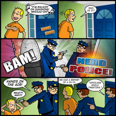 I had been looking for an excuse to bring the Nerd Police back, even though the characters undergo no development in any way, shape or form. They’re just a couple of nameless thugs with horn rim glasses and I like ’em that way! The concept is funny, at least. Well, funny to me, I guess.