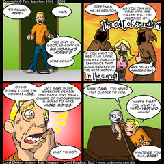 I gotta give it up to The SuiZ and Hustlertwo from Nuclear Powered Toaster. The sheer volume of references from Theater Hopper’s past in their comic reflects a familiarity with my work that I only share casual knowledge of! The Cult of Sandler and that paper-plate girl being impressive throwbacks! Good on ya, guys! And by the way, I think I want that third panel to become my new avatar. Great close up!
