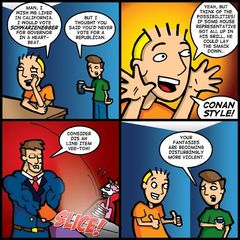 I don’t know how much I can add to the cacophony of opinions on the matter, but I will say this: Only in California could a candidate like Arnold Schwarzenegger run for governor and be taken seriously. If he tried to pull something like that in, oh, Nebraska, they’d laugh him right back to Austria.