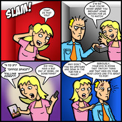 For any of my co-workers that might check this site, I don’t want them to think that today’s comic is an autobiographical reflection of how I view the workplace. On the contrary, I really like my job – so my take-home stress is marginal. I just wanted to do a comic with Cami in it where she had a chance to play a more positive role. This, as opposed to the more scolding archetype I’ve cast her in of late. She’s more nurturing in real life and I wanted to focus on that.