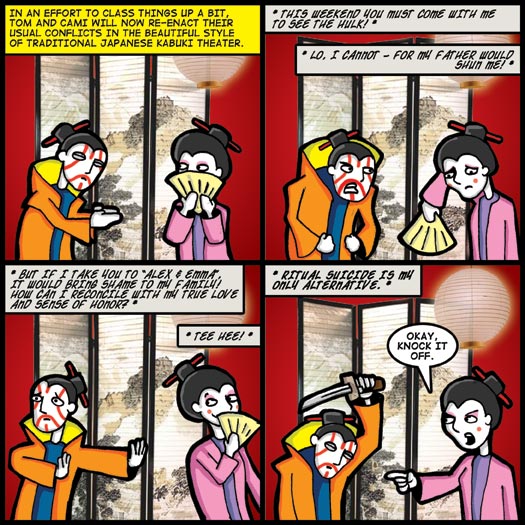 For anyone who is sensitive to these kinds of things, I’m not making fun of Kabuki or of Japanese culture. In fact, like most people, I’m facinated by everything about the country. I even took a course on Japan in college. This is just a little homage – my way of tipping the hat without mentioning anime.