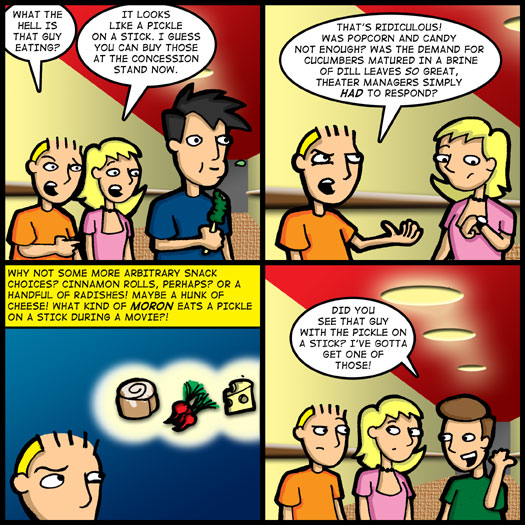 Why not some more arbitrary snack choices? Cinnamon rolls, perhaps? Or a handful of radishes! Maybe a hunk of cheese! What kind of MORON eats a pickle on a stick during a movie?