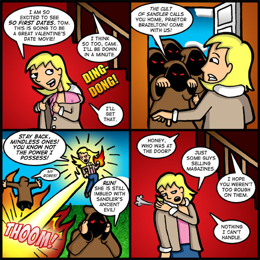So today is the culmination of The Cult of Sandler storyline. I’ve been getting some really positive feedback on it, so I guess you enjoyed it! Who knows, maybe our favorite cloaked fanboys will reappear sometime! They seemed to have gone over pretty well.