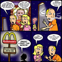 As the comic depicts, Cami and I did get to see Super Size Me this weekend. How we managed to avoid the minefield of crap carpet bombing theaters last week is still beyond my comprehension. Aw… We missed Garfield? NUTS!