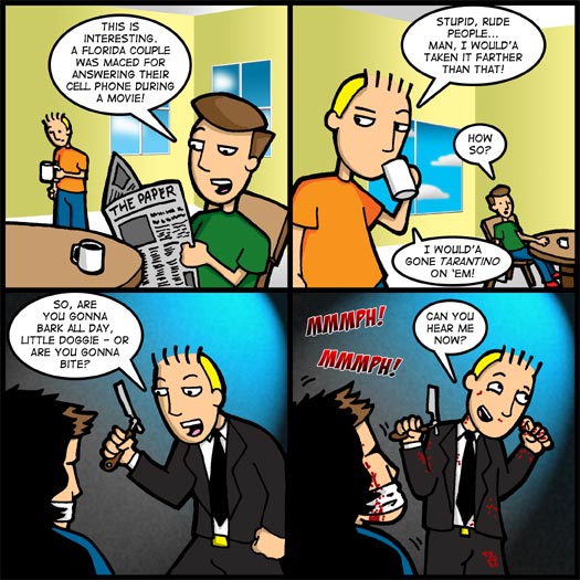 Is the story that Jared mentions in today’s comic true? You betcha. It happened a couple of days ago in St. Petersburg, Florida. A woman was maced by a security officer for answering her cell phone during the opening credits of Catwoman.