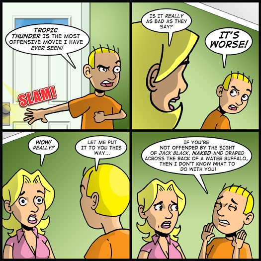 For the record, I haven’t had a chance to see Tropic Thunder yet – even though it was released in theaters on Wednesday. But I read an interview in Entertainment Weekly and they spilled the beans about Jack Black’s birthday suit appearance. It has put me off food for the last two days, but it was great fodder for the comic and an excellent way to deflate some of the seriousness surrounding the controversial aspects of the film.Jack Black’s