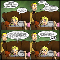 To make it up to you, I drew a pretty picture of Tom firing a phaser from Star Trek. To see it, vote for Theater Hopper at Top Web Comics. And in case you’re not catching the reference Tom is making to the slinky dress and the green body paint, that was a sexual escapade introduced in last Friday’s comic.