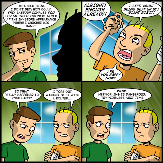 I realize that the punchline to today’s comic is kind of “hur-hur,” but the great thing about it is that it was something literally said by real-life Jared after I posted to my Facebook page about my adventures in the ER. At the time, I kind of groaned at the pun. But now I appreciate it for what it is. Thanks, good buddy!