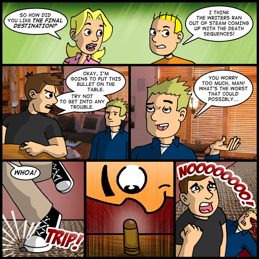 For whatever it’s worth, I’d really like to see a movie where someone trips over their shoes, falls on top of a bullet and dies. Even if it happens in one of those stupid Scary Movie films. Can someone make this happen?