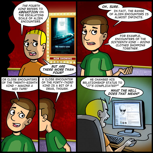 Good comic. It also reminded me that when I was a kid watching saturday morning cartoons, “Garfield and Friends” did a gag similar to this one. They listed off a dozen different ridiculous close encounter types, like picking up your dry cleaning and such.
