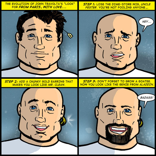Anyway, I’ll stop harping on the immaterial. Although I still think Travolta looks like a genie in the stills and trailer for From Paris With Love.