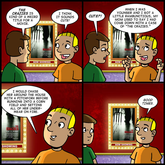I will maintain, however, that I think “the crazies” still sounds cute to my ears. Like “bedbugs,” or something. A gentle way of describing something disgusting or worrisome.
