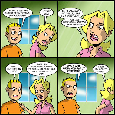 I think I must have blocked out Jackass Number Two, though. Because when I asked Cami if she had any interest in watching Jackass 3D this weekend, her opposition to the idea was much stronger than presented in the comic.
