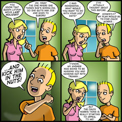 Probably a more effecitve incentive sketch would have been to draw Cami actually kicking Chuck Norris in the nuts. I wanted to do it, but Thursday was just crazy and I didn’t get started on the strip until late. So I went for some juvenile photo manipulation. I dunno. It’s kind of growing on me! NO I AM NOT ON DRUGS!